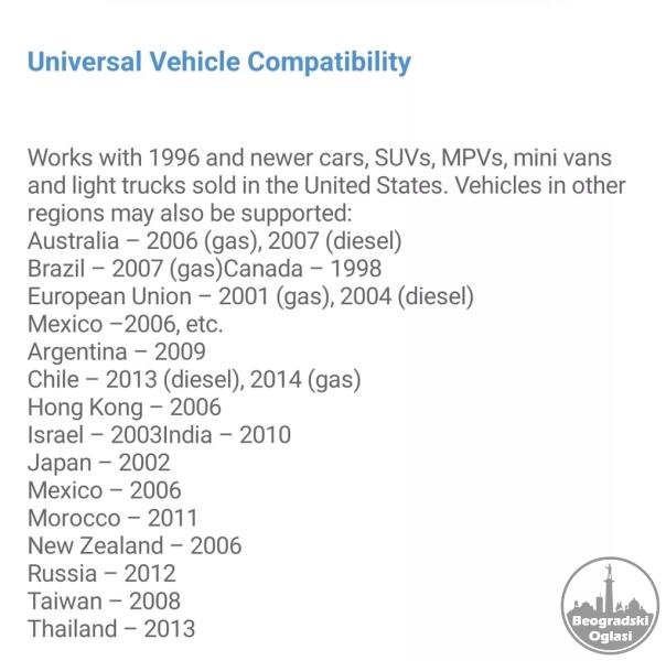 Radi sa 1996 i novijim automobilima, SUV-ovima, MPV-ima, mini kombijima i lakim kamionima koji se prodaju u Sjedinjenim Državama. Vozila u drugim regijama takođe mogu biti podržana: