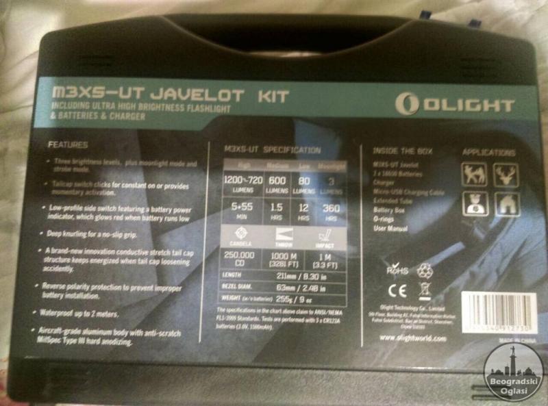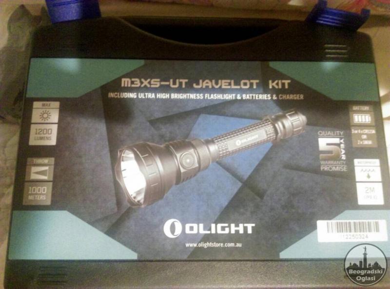 BATERIJSKA LAMPA najjaca na trzistu DOMET 800 M vodo otporna otporna na padoue do 2 metra idealna za lov Olight m3x . u kutiji dobijate novu lampu, punjac ,2 olight baterije, rezervne gumice, uputstvo i plasticni drzac lampe koji ide na pusku. Ako zelite magnetni drzac doplata 1700 din. Sve novo.