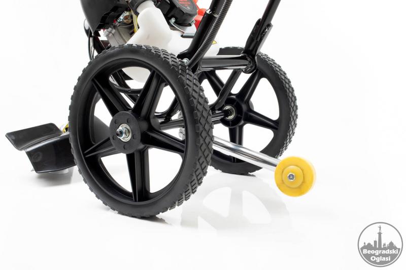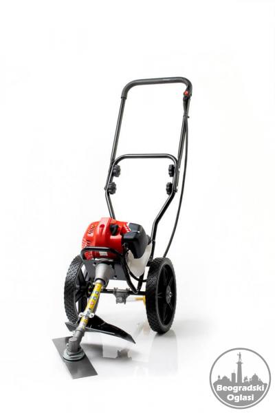 Trimer na kolicima koji funkcioniše kao gotovo svaki drugi trimer, osim toga što je namenjen onima koji ne žele da tegle 10 – 15kg na svojim leđima. Košenje trimerom na guranje znatno umanjuje umor i olakšava jedan od težih poslova (košenje trave).